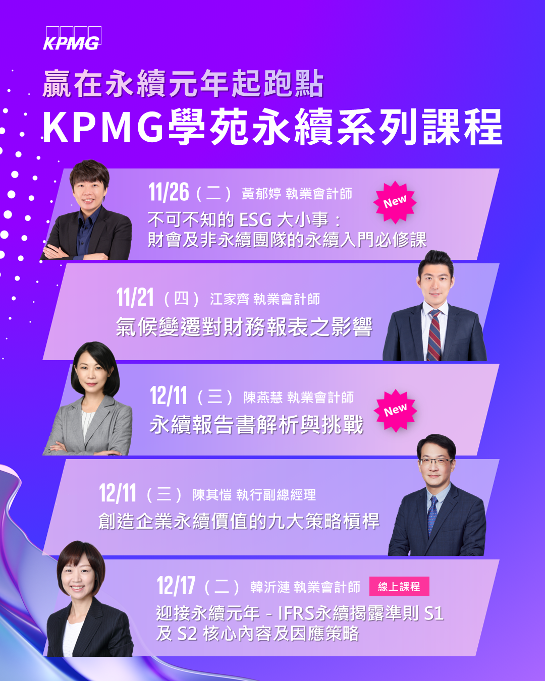 面對極端氣候風險持續進逼,各國政府與全球企業紛紛祭出減碳管理與循環經濟因應。歐洲的碳關稅於2023年即將試行於高耗能產品,至2026年全面生效。蘋果更承諾要在2030年對供應鏈和產品實現100%碳中和。2021年7月中國碳排放權交易市場已正式啟動上交易,成為世界規模最大市場。國內則從2021年開始要求用電大戶使用一定比例的再生能源電力並規劃將於2024年開始課徵碳費,台灣之碳權交易所並已於2023年8月7日成立,希望透過各種機制落實碳排放減量。企業投資ESG必要的成本如何最適化,同時發揮組織轉型以提升競爭力,本課程針對此波掀起的綠色浪潮介紹企業精準減碳的PDCA法則,包括各種減碳實務及運用數位工具蒐集分析資料設定淨零碳排計畫,並分享實績案例說明如何結合精實管理手法使ESG推動成為日常管理實務,讓公司治理主管、財會主管、企業各功能主管與董監事迅速掌握公司經營策略與營運績效之影響!▍KPMG陪伴您一同發展企業永續價值,系列課程完整克服永續難題▍11/21(四)氣候變遷對財務報表之影響 https://bit.ly/40YY8hj11/26(二)不可不知的ESG大小事:財會及非永續團隊的永續入門必修課 https://bit.ly/48Xa1G912/11(三)永續報告書解析與挑戰 https://bit.ly/4fRugHN12/17(二)線上聽🎧IFRS永續揭露準則S1及S2核心內容及因應策略 https://bit.ly/3AP0zbq碳管理與溫室氣體盤查、社會創新大不同...精彩課程陸續規劃中
